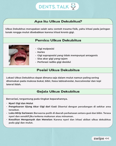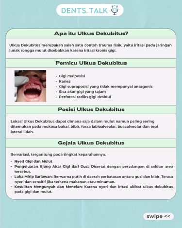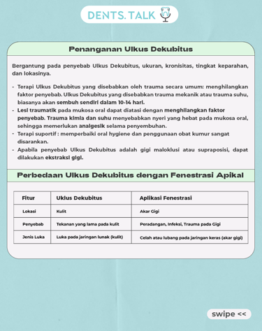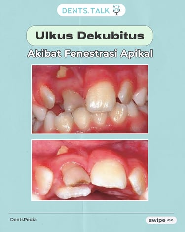 Fenestrasi Apikal merupakan kondisi dimana akar gigi menembus tulang di sekitar gusi yang menyebabkan luka pada jaringan sekitar rongga mulut yang disebut dengan Ulkus Dekubitus.